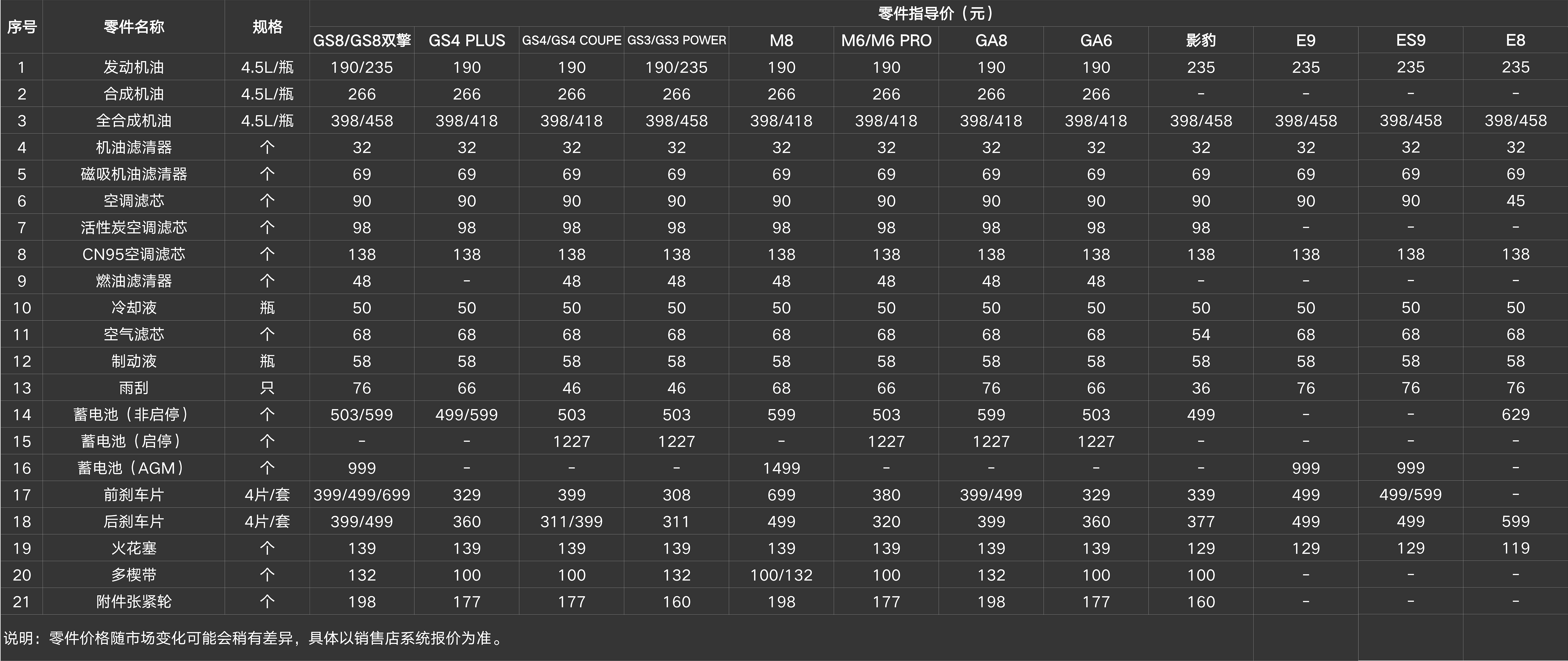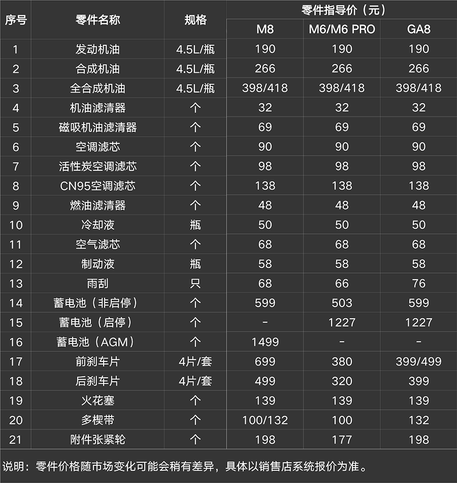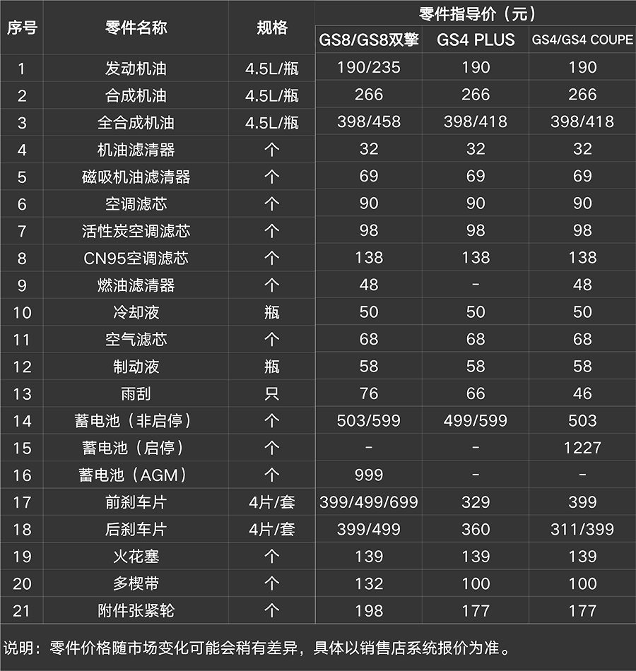 1、詳細(xì)的純正零部件價(jià)格可咨詢當(dāng)?shù)劁N售服務(wù)店,或致電廣汽傳祺服務(wù)熱線:400-813-6666(只需付市話通訊費(fèi))